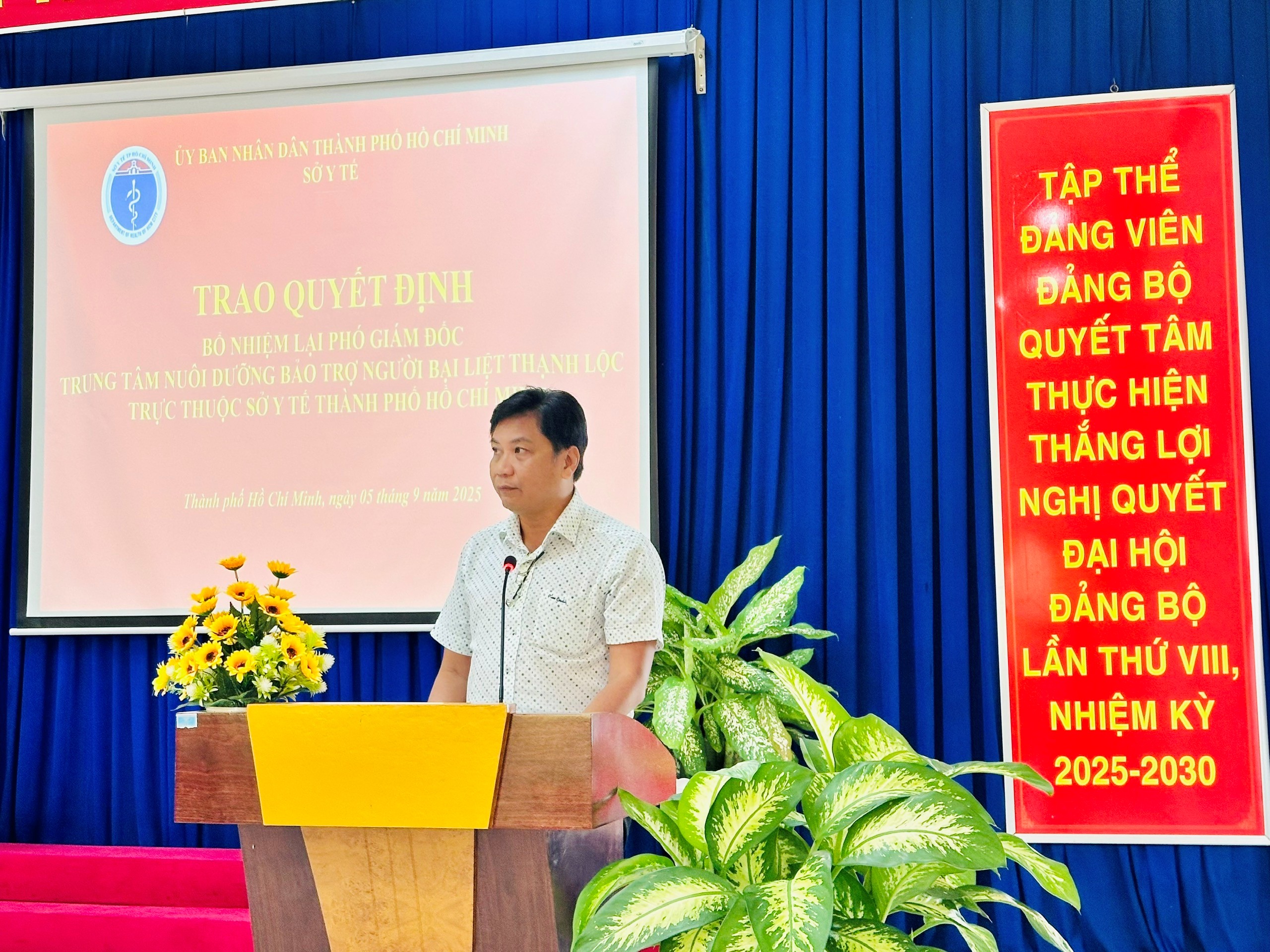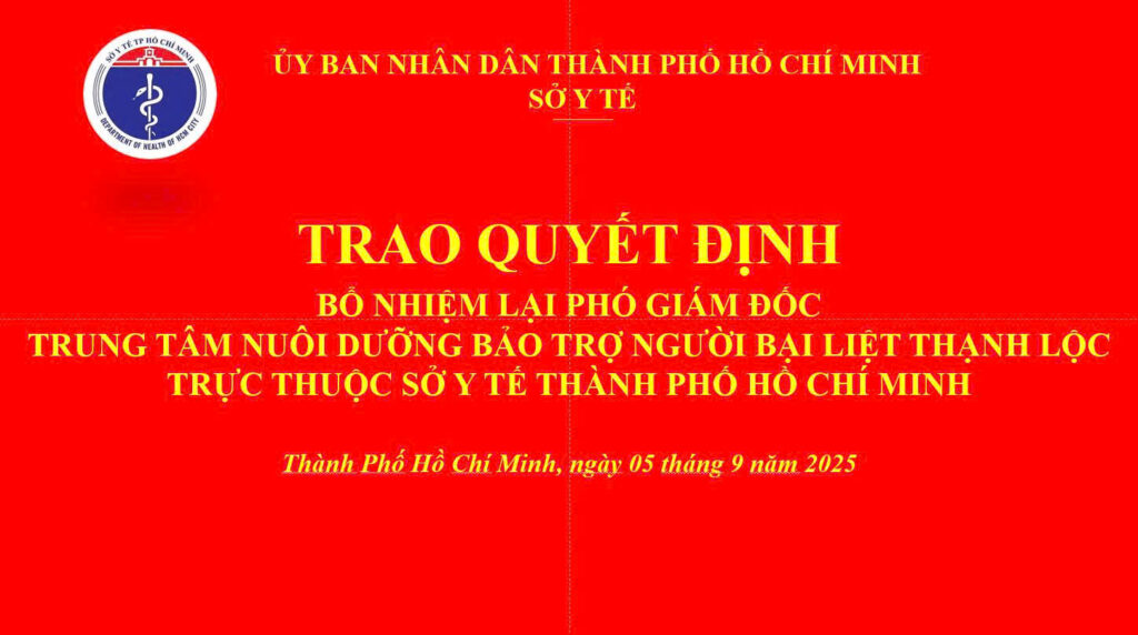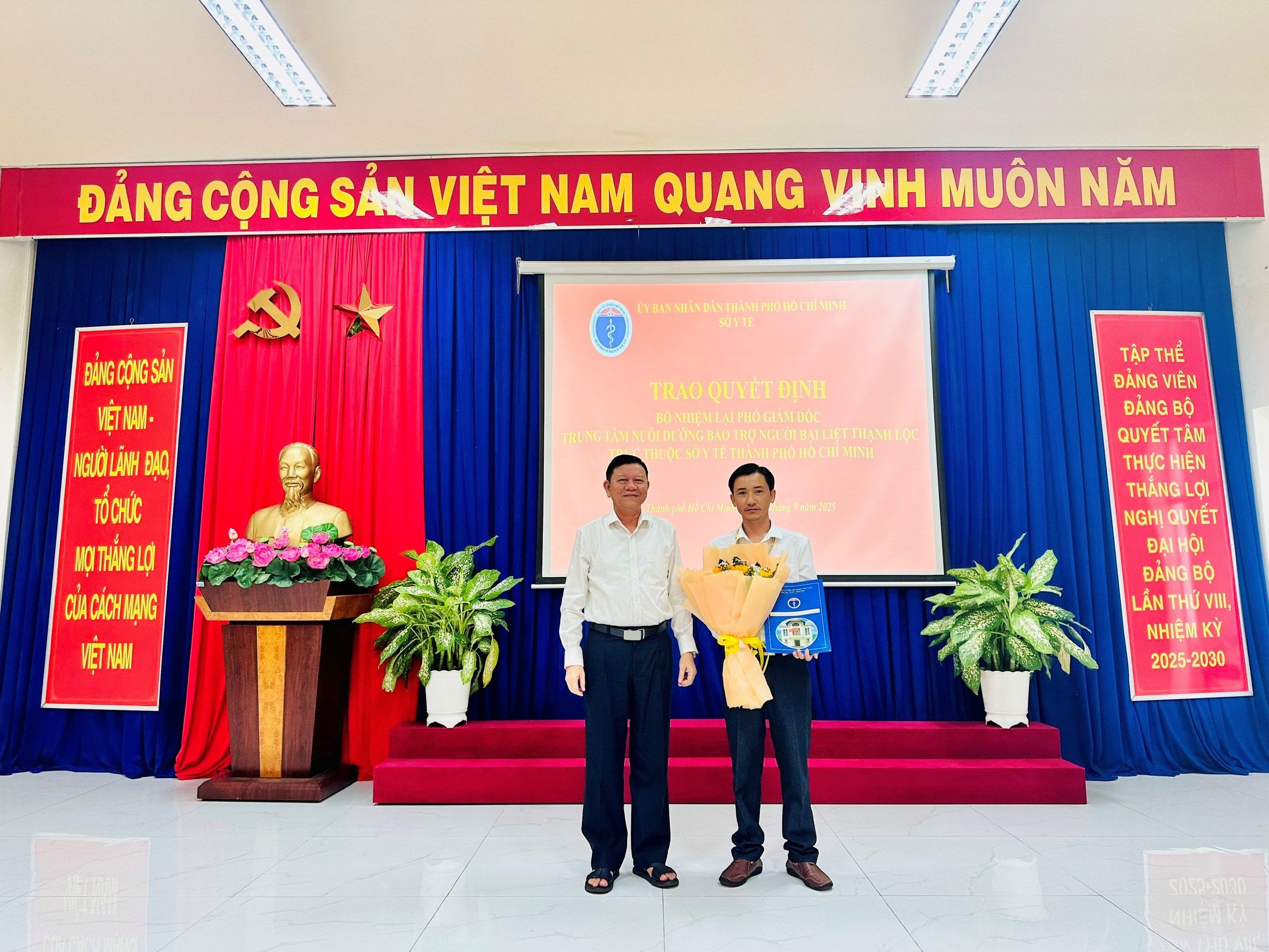 Trong thời gian qua, công tác kiện toàn bộ máy lãnh đạo luôn được các cấp, các ngành quan tâm thực hiện nhằm bảo đảm tính ổn định, liên tục trong điều hành và quản lý. Sáng ngày 05/9/2025, đồng chí Nguyễn Tăng Minh, Phó Giám đốc Sở Y tế Thành phố Hồ Chí Minh và Bác sĩ CKII Lê Mạnh Hùng – Phó Trưởng phòng Tổ chức Cán bộ Sở đã đến Trung tâm trao Quyết định bổ nhiệm lại chức vụ Phó Giám đốc Trung tâm Nuôi dưỡng bảo trợ người bại liệt Thạnh Lộc đối với đồng chí Lê Huy Phong. Thời gian giữ chức vụ là 05 năm từ ngày 08 tháng 9 năm 2025.