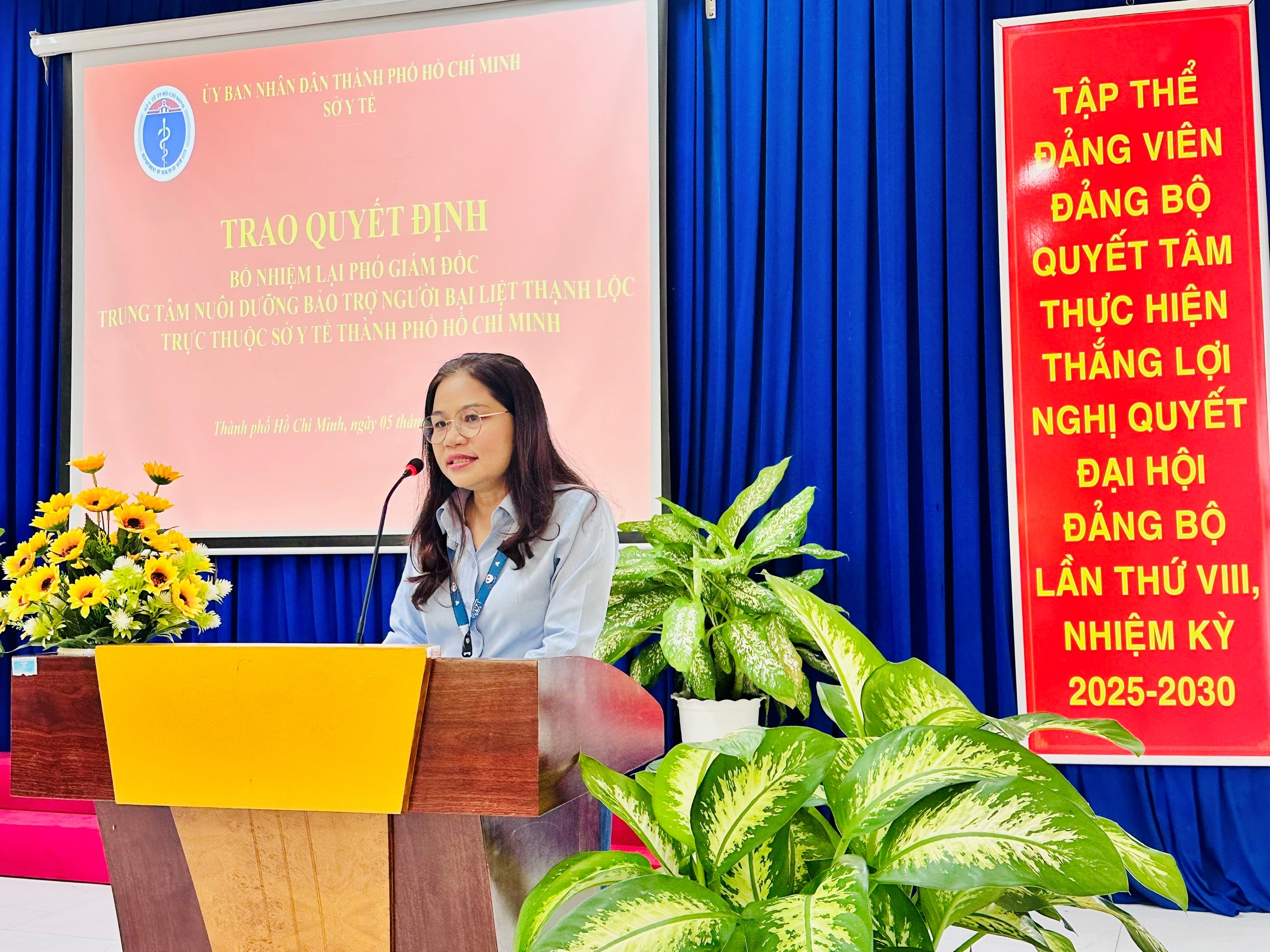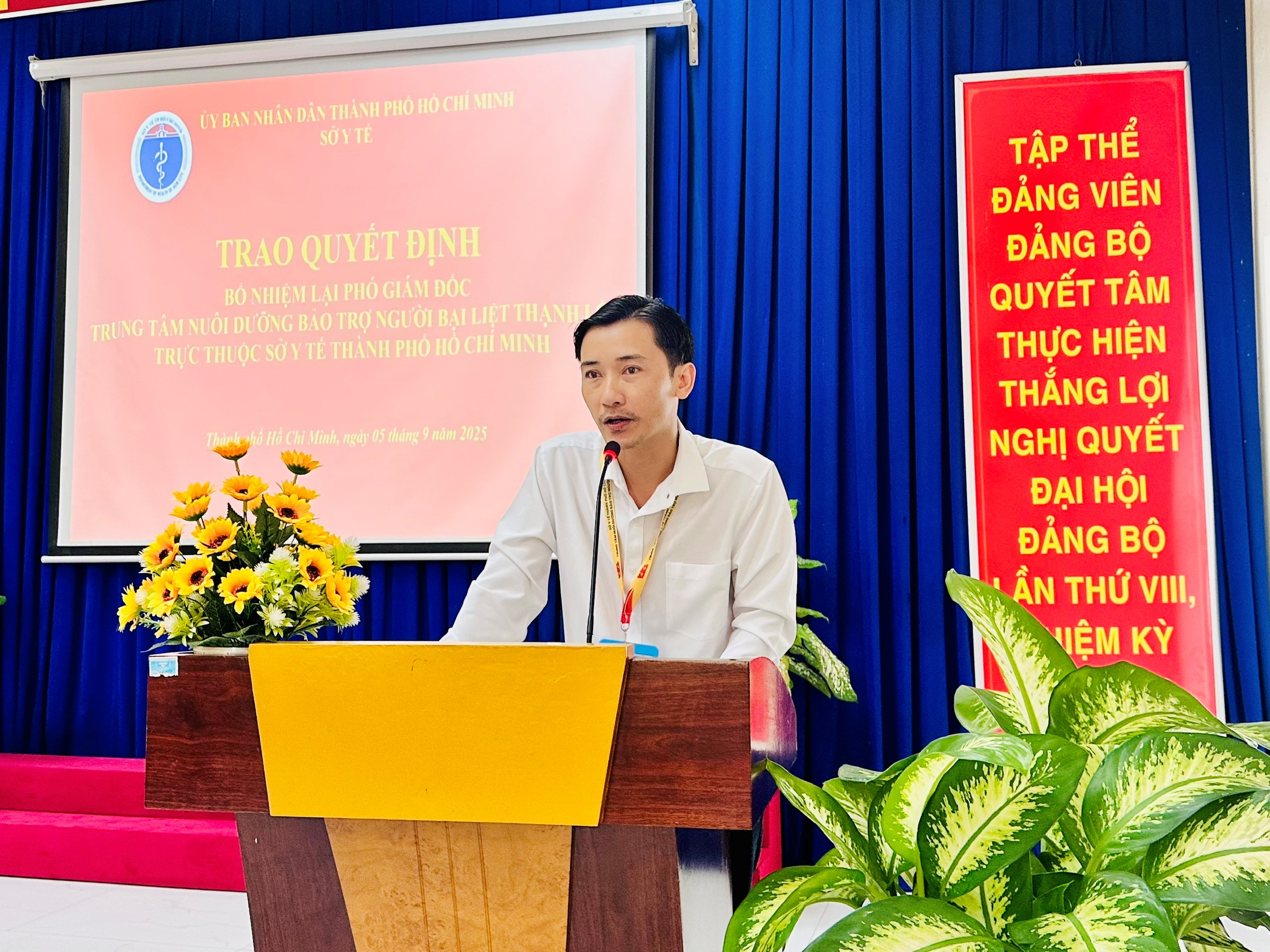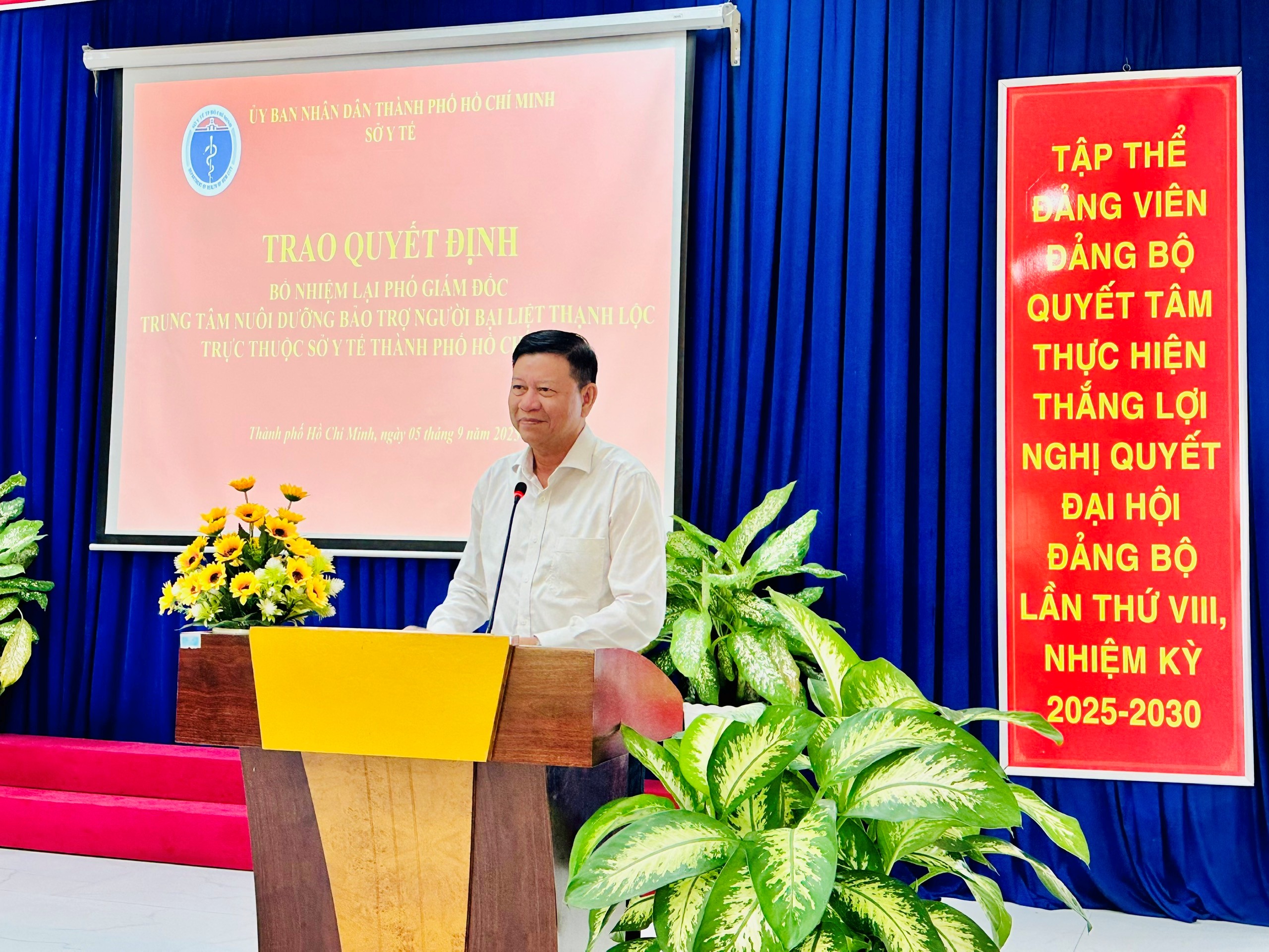 Trong thời gian qua, công tác kiện toàn bộ máy lãnh đạo luôn được các cấp, các ngành quan tâm thực hiện nhằm bảo đảm tính ổn định, liên tục trong điều hành và quản lý. Sáng ngày 05/9/2025, đồng chí Nguyễn Tăng Minh, Phó Giám đốc Sở Y tế Thành phố Hồ Chí Minh và Bác sĩ CKII Lê Mạnh Hùng – Phó Trưởng phòng Tổ chức Cán bộ Sở đã đến Trung tâm trao Quyết định bổ nhiệm lại chức vụ Phó Giám đốc Trung tâm Nuôi dưỡng bảo trợ người bại liệt Thạnh Lộc đối với đồng chí Lê Huy Phong. Thời gian giữ chức vụ là 05 năm từ ngày 08 tháng 9 năm 2025.