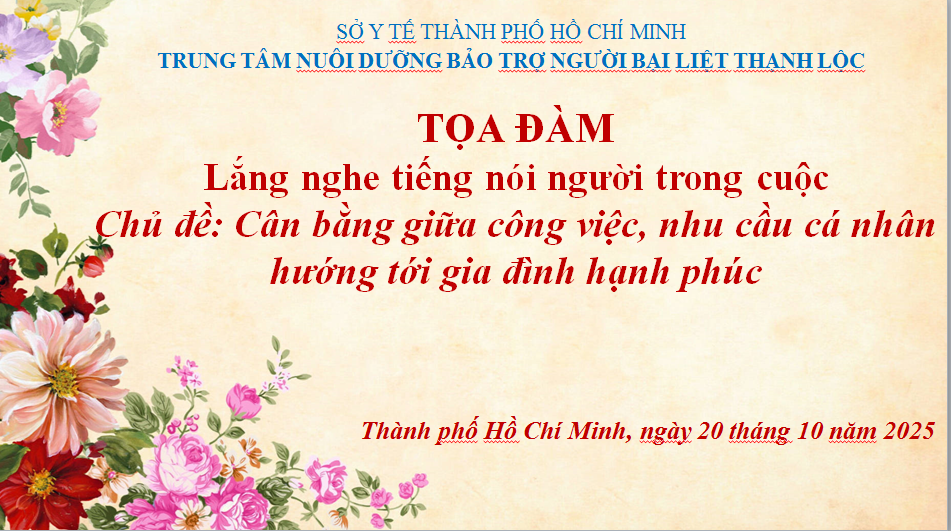 Thực hiện Công văn số 62-CV/ĐUTL ngày 02 tháng 10 năm 2025 của Đảng ủy Trung tâm Nuôi dưỡng bảo trợ người bại liệt Thạnh Lộc về lãnh đạo thực hiện “Tháng cùng phụ nữ hành động”, sáng ngày 20/10/2025 Trung tâm Nuôi dưỡng bảo trợ người bại liệt Thạnh Lộc tổ chức các hoạt